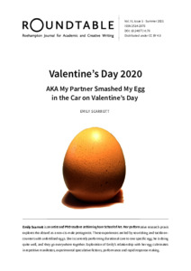 Scarrott, Emily (2021) Valentine’s Day 2020, (AKA My Partner Smashed My Egg in The Car on Valentine’s Day). Roehampton Journal for Academic and Creative Writing, 3 (1). p. 3. ISSN 2514-2070