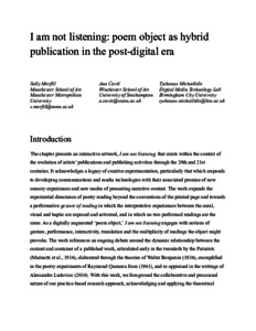 The chapter presents an interactive artwork, I am not listening, that exists within the context of the evolution of artists’ publications and publishing activities through the 20th and 21st centuries. It acknowledges a legacy of creative experimentation, particularly that which respondsto developing communications and media technologies with their associated promise of new sensory experiences and new modes of presenting narrative content. The work expands the experiential dimension of poetry reading beyond the conventions of the printed page and towards a performative gesture of reading in which the interpretative experiences between the aural, visual and haptic are exposed and activated, and in which no two performed readings are the same.