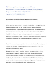 Patel, Karen (2022) In conversation with Deirdre Figueiredo MBE, Director of Craftspace. European Journal of Cultural Studies, 25 (6). pp. 1652-1664. ISSN 1367-5494