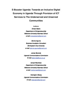 Abaho, Ernest and Aguma, Dennis and Beronda, James and Nkambwe, Ismael and Obang, Hanington and Kituyi, Geoffrey Mayoka (2024) E-Booster Uganda: towards an inclusive digital economy in Uganda through provision of ICT services to the underserved and unserved communities. Universal Access in the Information Society. ISSN 1615-5289