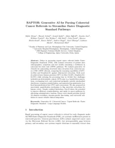 Bilal, Muhammad and Abioye, Sofiat and Akanbi, Lukman A. (2025) RAPTOR: Generative AI for Parsing Colorectal Cancer Referrals to Streamline Faster Diagnostic Standard Pathways. In: 28th International Conference on Medical Image Computing and Computer Assisted Intervention, 23rd-27th Sept 2025, Daejeon, Democratic People's Republic of Korea.