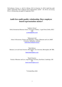 Owusu, Andrews and Atif, Muhammad and Holmes, Mark and Omoteso, Kamil (2025) Audit fees-audit quality relationship: Does employee board representation matter? The British Accounting Review. ISSN 1095-8347