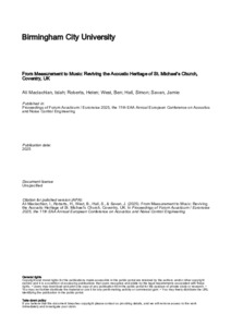 Ali-MacLachlan, Islah and Roberts, Helen and West, Benjamin and Hall, Simon and Savan, Jamie (2025) From Measurement to Music: Reviving the Acoustic Heritage of St. Michael’s Church, Coventry, UK. In: Forum Acusticum Euronoise 202, 23rd-26th June 2025, Malaga, Spain.