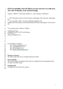 Gifford, Anthony J. and Jaspal, Rusi and Jones, Bethany A. and McDermott, Daragh T. (2025) PrEP acceptability and self-efficacy in men who have sex with men: The roles of identity, trust and knowledge. Psychology & Sexuality. ISSN 1941-9902