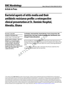Bedzina, Israel and Deku, John Gameli and Ablordey, Kenneth and Goloe, Francisca Esenam and Eshun, Vida Angmorkie and Agyei, Eunice and Nmoandor, Jonathan Maniye and Womorde, Mark and Aninagyei, Enoch and Duedu, Kwabena (2025) Bacterial agents of otitis media and their antibiotic resistance profile: a retrospective clinical presentation at St. Dominic Hospital, Akwatia, Ghana. BMC Microbiology. ISSN 1471-2180