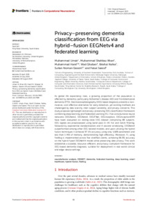 Umair, Muhammad and Khan, Muhammad Shahbaz and Hanif, Muhammad and Ghaban, Wad and Nafea, Ibtehal and Qasem, Sultan Noman and Saeed, Faisal (2025) Privacy–preserving dementia classification from EEG via hybrid–fusion EEGNetv4 and federated learning. Frontiers in Computational Neuroscience, 19. ISSN 1662-5188