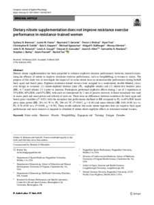 Brennan, Sydney N. and Foster, Justin M. and Gerardo, Raymond T. and Molnar, Trevor J. and Tran, Ryan and Sottile, Christopher B. and Geppert, Kyle S. and Egiazarian, Michael and Ballhagen, Abigail F. and Ghimire, Money and Renwick, John R. M. and Gough, Lewis A. and Gonzalez, Stewart D. and Allen, Jason D. and Rowland, Samantha N. and Bailey, Stephen J. and Pennell, Adam and Tan, Rachel (2026) Dietary nitrate supplementation does not improve resistance exercise performance in resistance-trained women. European Journal of Applied Physiology. ISSN 1439-6319