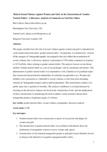 This paper considers how the risk of sexual violence against women and girls is topicalized in social media interaction about ‘gender-neutral toilets’. In particular, it examines how versions of the category of ‘transgender people’ are assigned a key role within the construction of sexual violence risk. A discursive analysis is presented of 1756 online comments in response to 10 YouTube videos relating to gender-neutral toilets. The analysis focuses on one theme entitled ‘Gender-neutral toilets as a site of sexual danger’ and its constituent sub-themes. The phenomenon of gender-neutral toilets was responded to with a limited set of gendered tropes that constructed and positioned stakeholders in culturally recognisable ways. Women and children were constructed as vulnerable to sexual violence, at risk from men (including versions of ‘transgender women’) and in need of protection. This transformed a debate over public space into a question of morality. The analysis contributes to existing literature by focusing on the discursive features involved in the construction of risk, and the implications of these constructions in minimizing the need to address social structures that position transgender people as legitimate targets of violence.