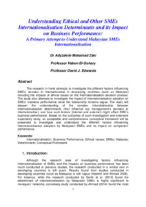 The research in hand attempts to investigate the different factors influencing SMEs’ decision to internationalise in developing countries (such as Malaysia) including the impacts of ethical issues on the internationalisation decision process. The study also attempts to investigate the impact of internationalisation adoption on SMEs’ business performance since the relationship remains vague. The study will deepen the understanding of the complex interrelationship between internationalisation determinants (that influence top management’s decision to internationalise), and how such factors (internal and external) might affect SME’s business performance. Based on the outcomes of such investigation and extensive exploratory study, an acceptable and comprehensive conceptual framework will be presented to investigate and understand the different factors influencing internationalisation adoption by Malaysian SMEs and its impact on companies’ performance.
